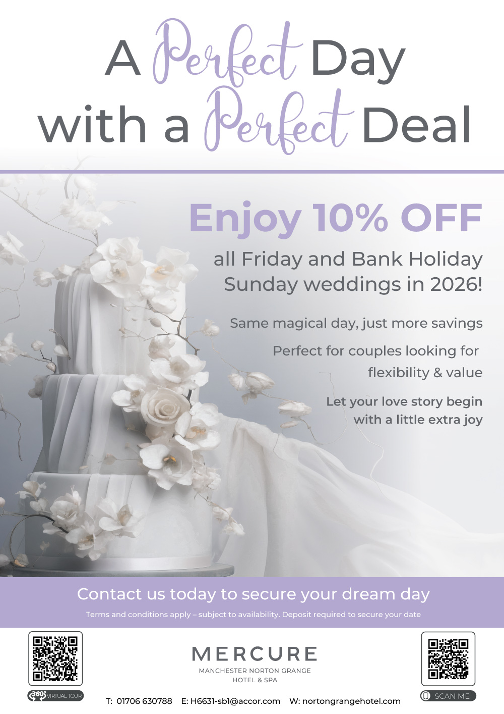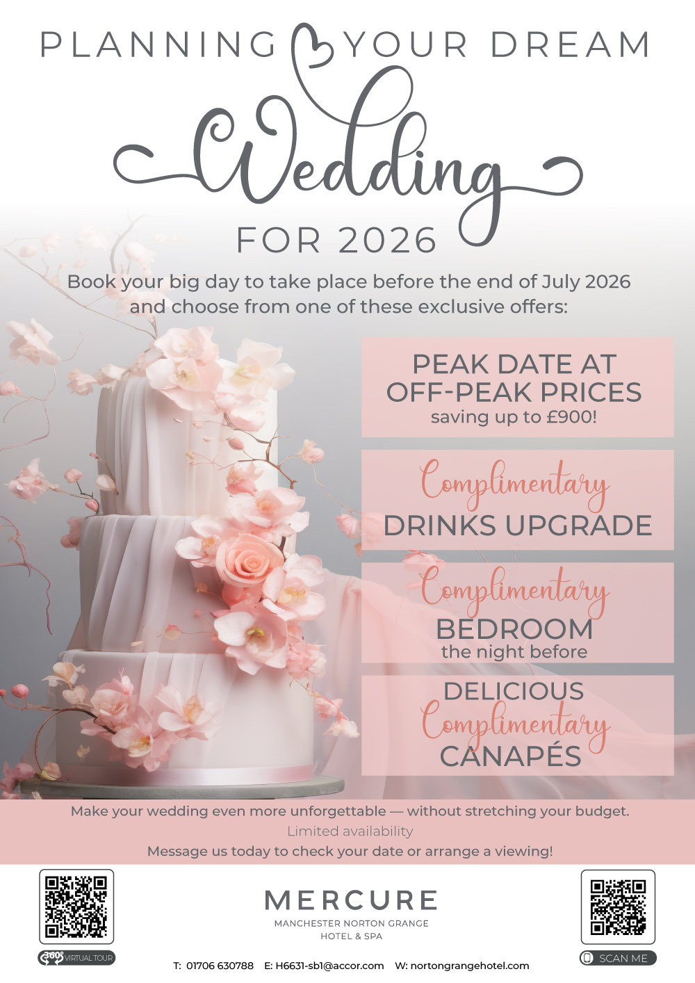 Say "I do" at the stunning Mercure Norton Grange Hotel in Rochdale with our limited-time wedding offer for couples booking for 2026. Enjoy peak dates at off-peak prices, saving up to £900 on your special day. Make your celebration even more memorable with a complimentary drinks upgrade, a free bedroom the night before, and delicious complimentary canapés for your guests. Don’t miss out on these exclusive wedding deals—contact our dedicated wedding team today and start planning your perfect day at one of Rochdale’s most romantic wedding venues.